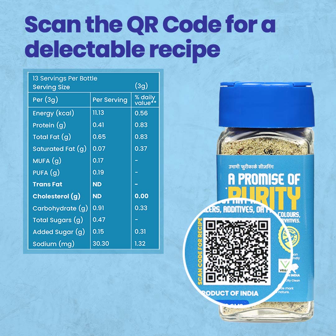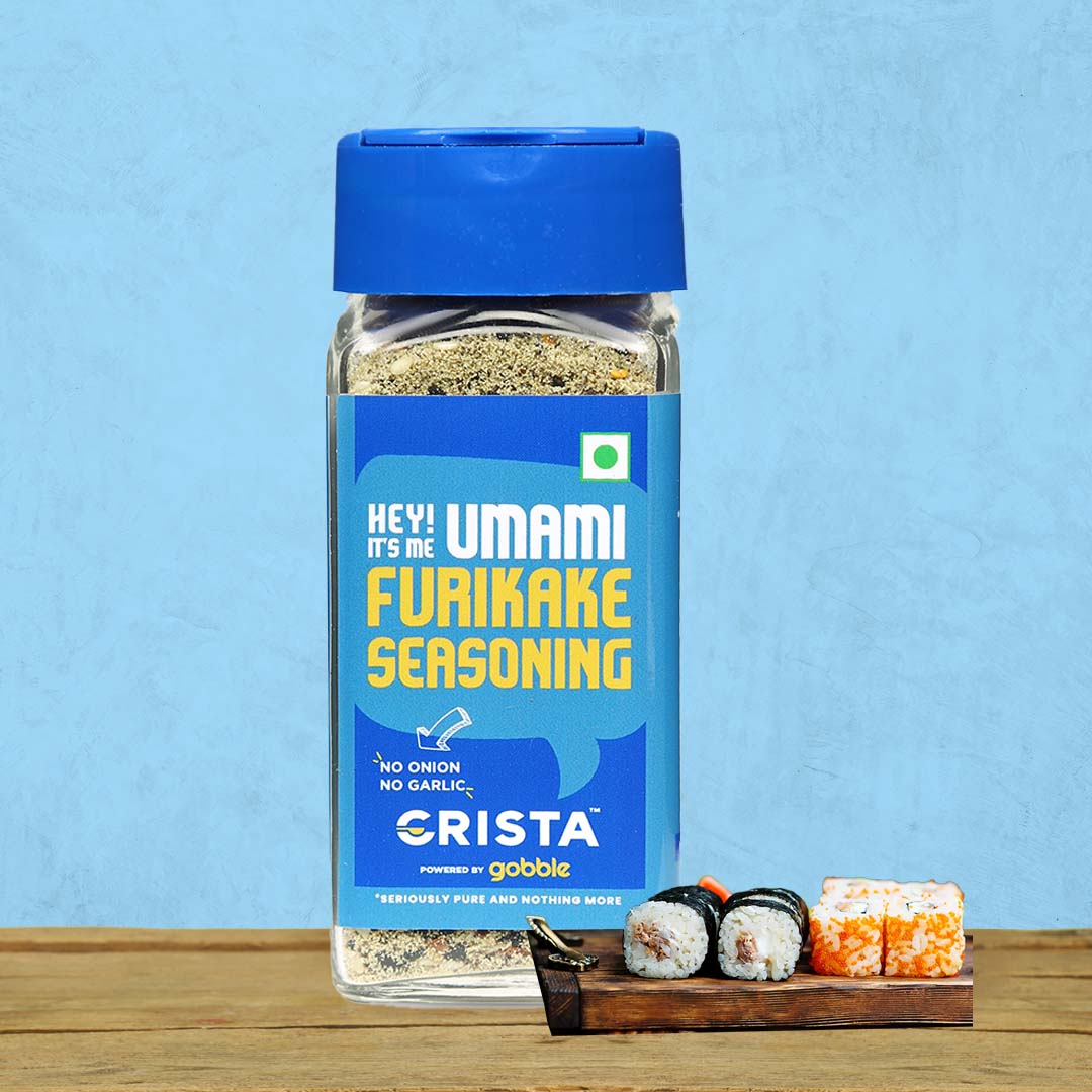 "Hey! Its me Umami Furikake Seasoning. CRISTA Furikake Seasoning is a mutipurpose Japanese seasoning used to add a nutty and salty flavour to a dishes ranging from rice and sushi to avocado on toast, eggs, vegetables, tofu and salmon. Just sprinkle some of the seasoning based on your preference and enjoy the complex, salty unique flavour imparted on your daily food. Curated for the modern Indian consumer yearning for explosions of complex flavour, this multipurpose seasoning has become very popular with amateur chefs and home cooks who are looking to add new flavours in their daily cooking. Freshly machine ground using our sophisticated hammer crushers and micro pulverisers, the blend is mixed in an automatic GMP blender to achieve the desired balance and consistency."