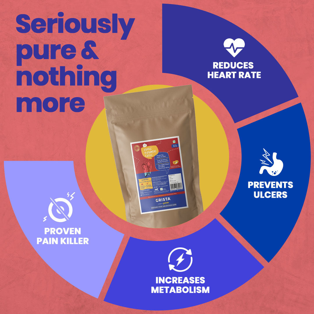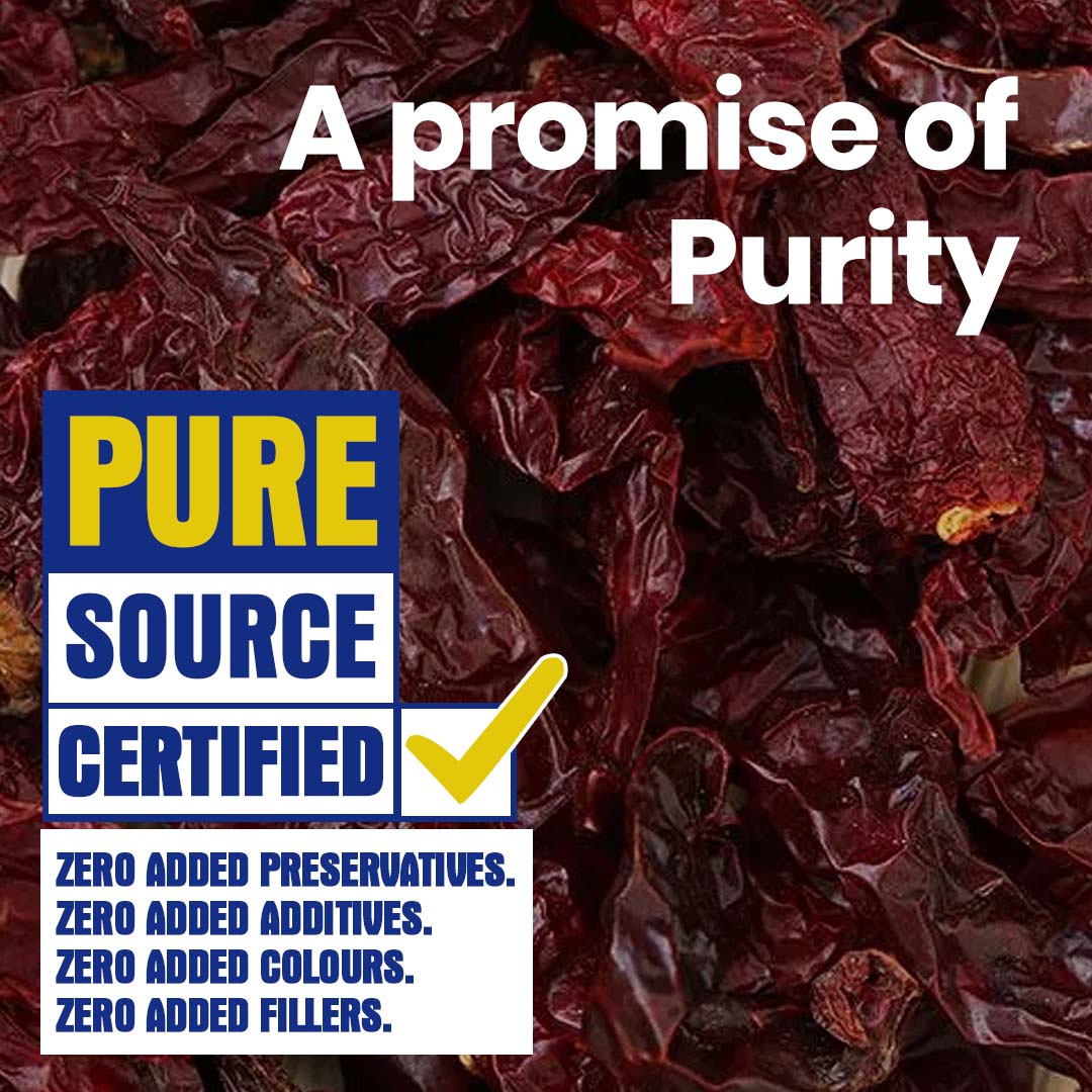 Hey! Its me Kashmiri Chilli. Proud of: My vibrant red colour. Premium grade, original, pure, natural and sundried Kashmiri chillis are procured directly from the farms of Byadgi in Karnataka. Characterized by their chocolate brown, wrinkled complexion and wide-bodied appearance, these chillies are a staple in everyday Indian cooking, adding a vibrant and bright red colour with less heat. With a heat value (measured in Scoville Heat Units) of ~5,000-9,000 SHU, the chillis possess a mild heat note. Once sourced, the chillis are transported to the factory where they are cleaned and processed. Arguably, the most commonly used spice in daily cooking, this spice is commonly mistaken for Byadgi chilli which is slimmer in appearance and spicier in taste.
