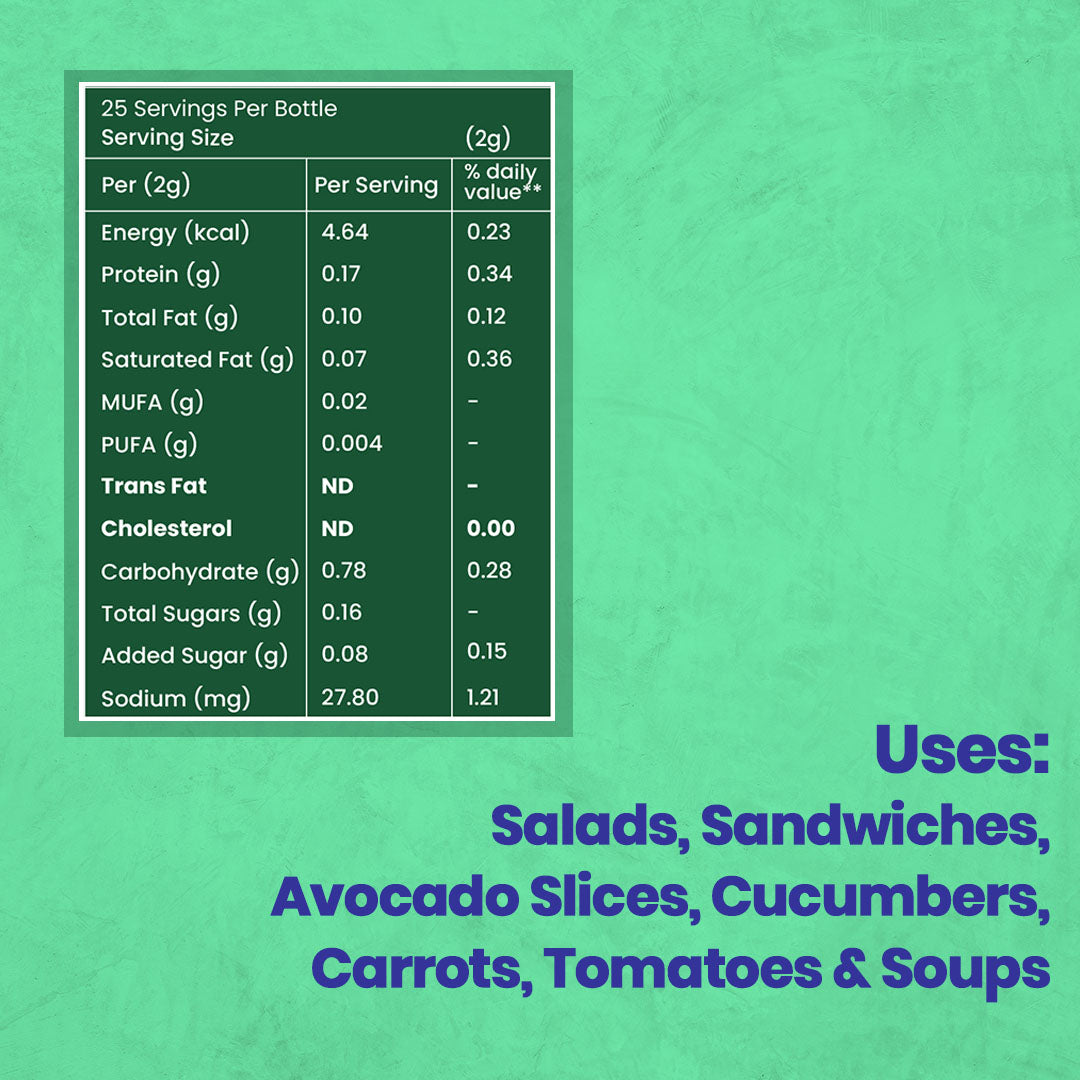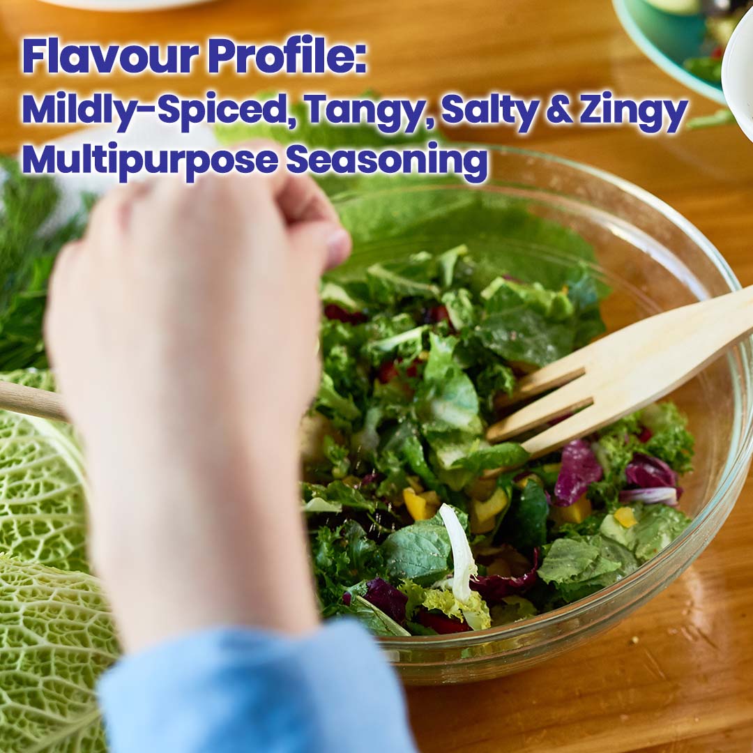 Hey! Its me Zingy Seasoning Salt. CRISTA Zingy Seasoning Salt is a truly versatile, multipurpose burst of salty, tangy and zingy flavour. It can be sprinkled on top of a salad, crispy iceberg lettuce, on freshly cut avocado slices, cucumbers, carrots and tomatoes, soups, sandwiches and fried eggs. It is also a delicious blend to season chicken or exotic vegetables like broccoli, mushroom, asparagus and bell peppers, just before grilling. Freshly machine ground using our sophisticated hammer crushers and micro pulverisers, the blend is mixed in an automatic GMP blender to achieve the desired balance and consistency.