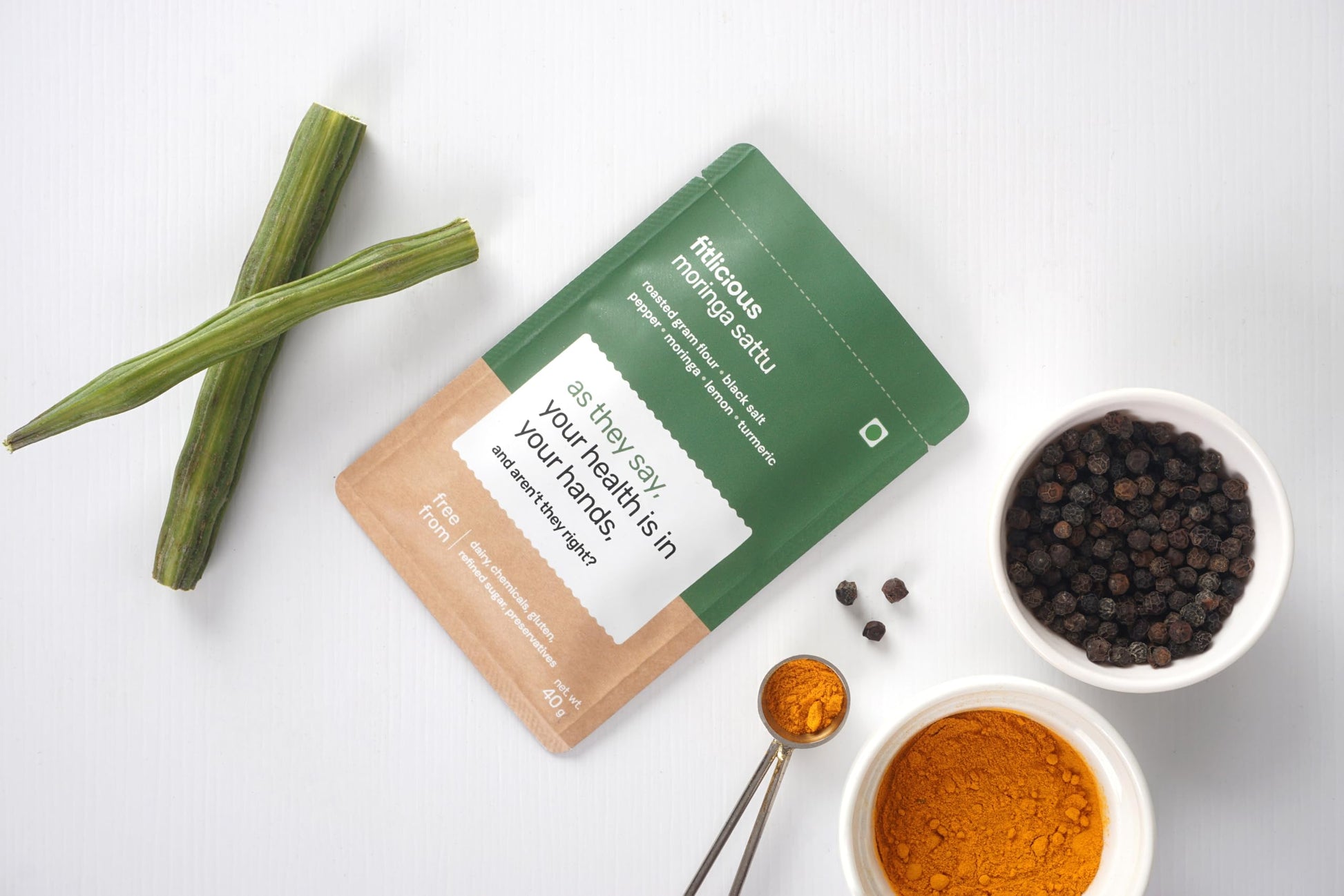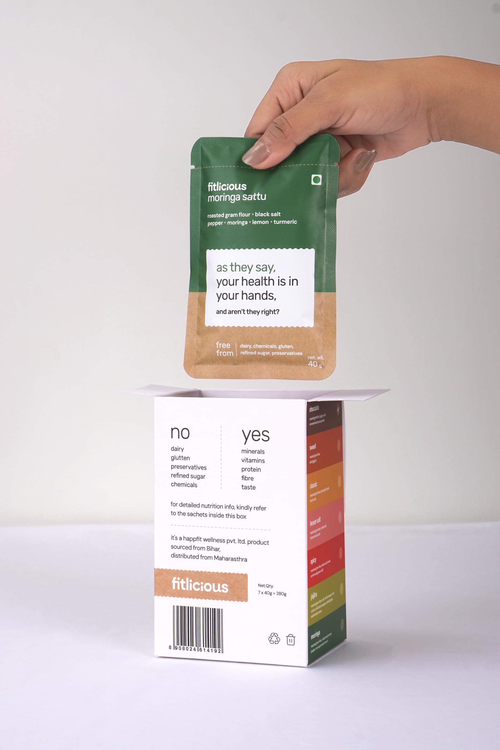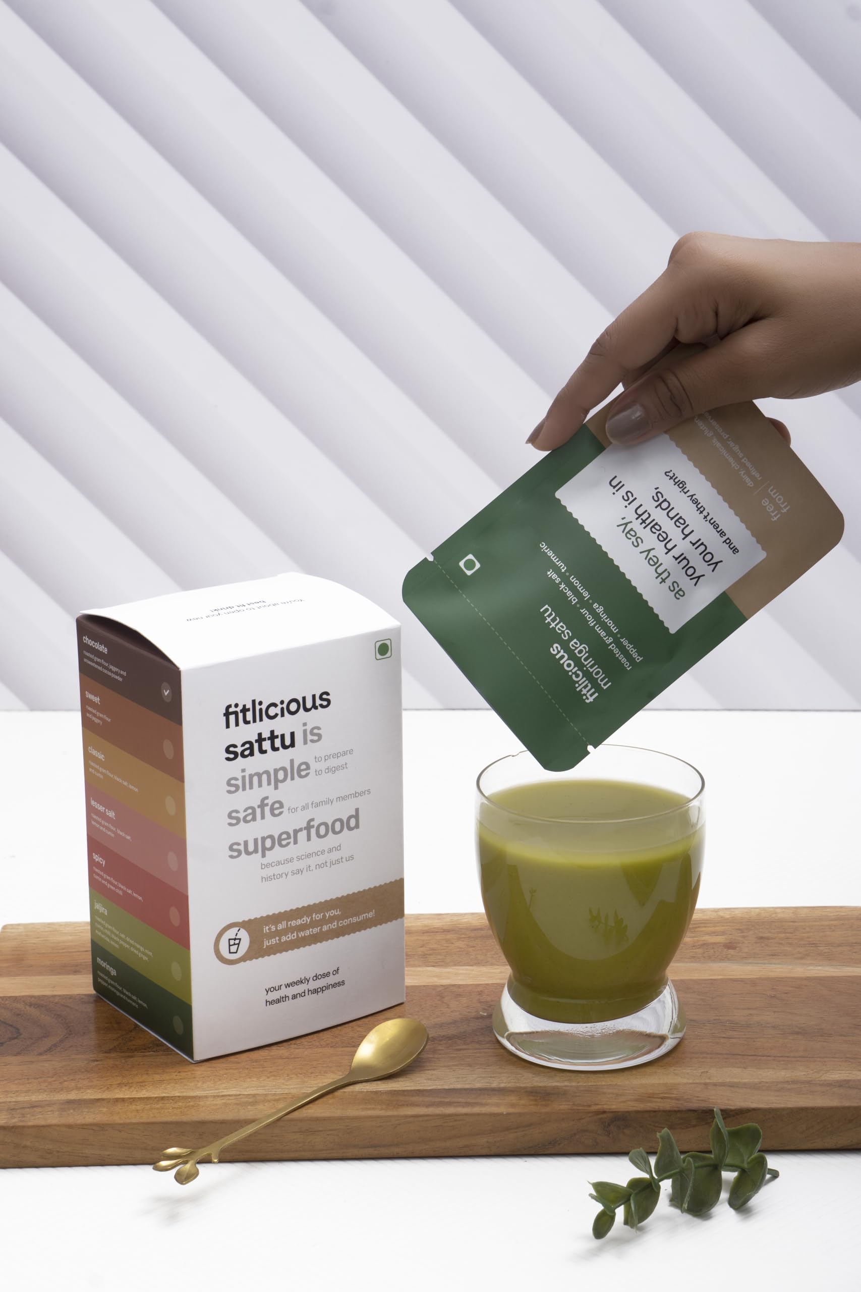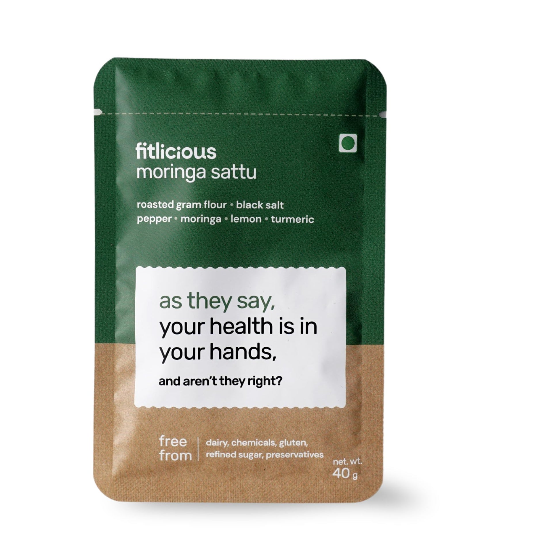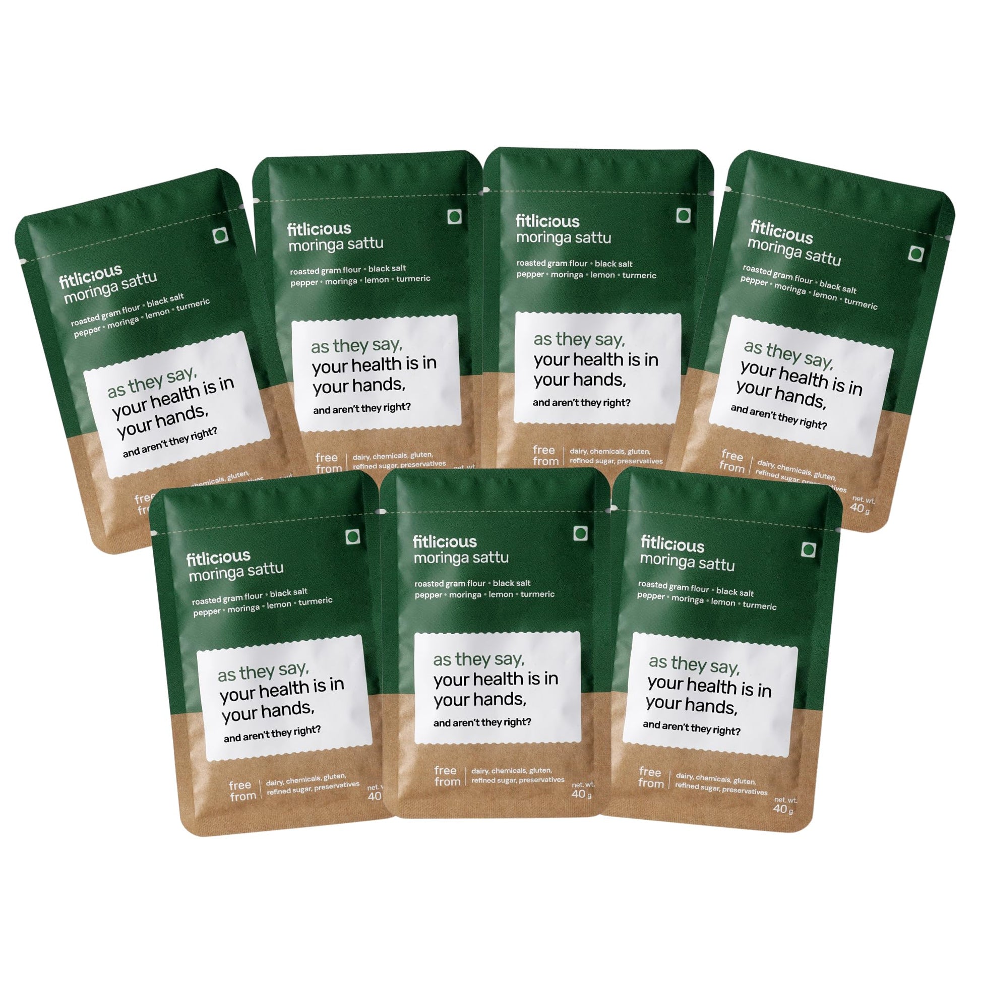Fitlicious Sattu Powder - Gluten-Free Roasted Gram Flour, Moringa Sattu Fiber-Rich Sattu Drink Powder (Pack of 7, 40g Each)