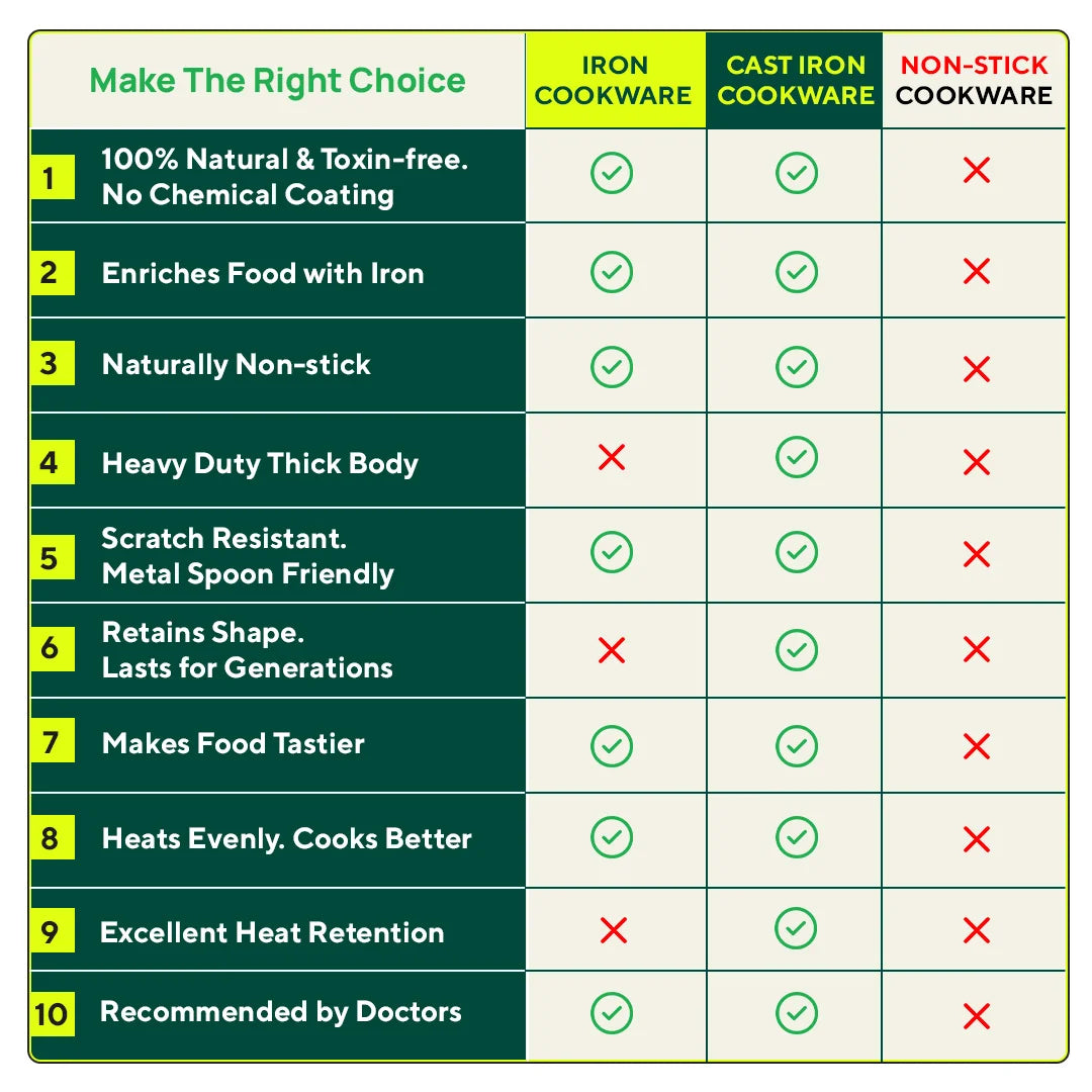 🤤ENHANCES FOOD’S FLAVOUR: Besides, it will enhance the taste of any dish by adding distinct flavours. We often find cooking in iron cookware can help to reduce the consumption of oil. This helps us to ensure we do not intake loaded fats into our system which is not healthy.