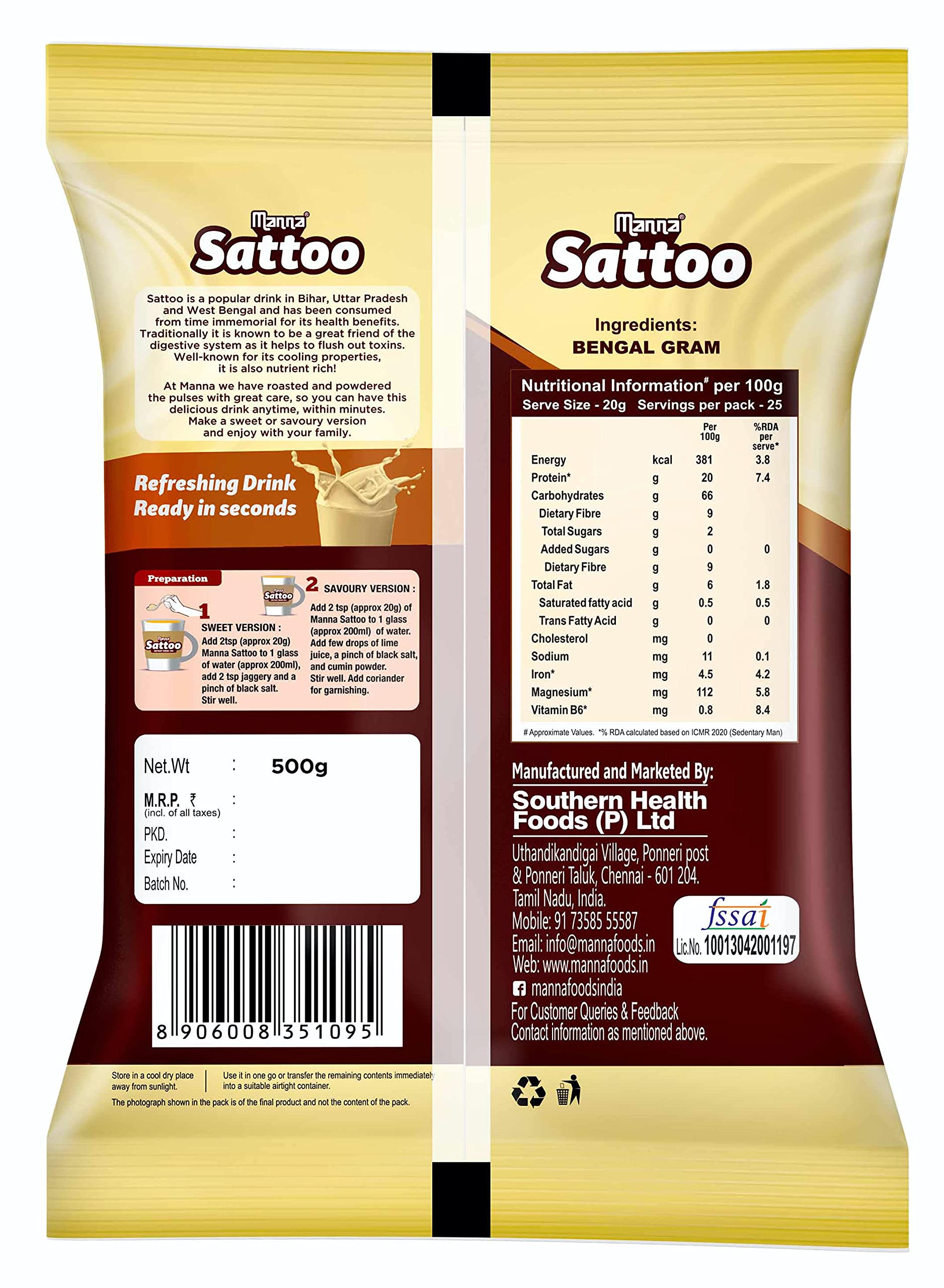 Details: Manna Sattu/ Sattoo Drink Mix (100% Natural) - Indian Protein Mix, High Fibre, Healthy Roasted Chickpeas Flour - 1 Kg (500g x 2 Packs)