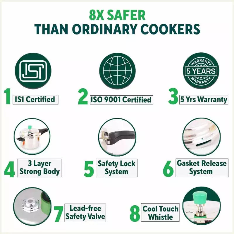 For your utmost protection, it has triple safety features that include lead-free safety valve, controlled gasket release system and pressure locked safety lid. While it is ISI and ISO certified, the steel pressure cooker comes with a 5-year warranty.