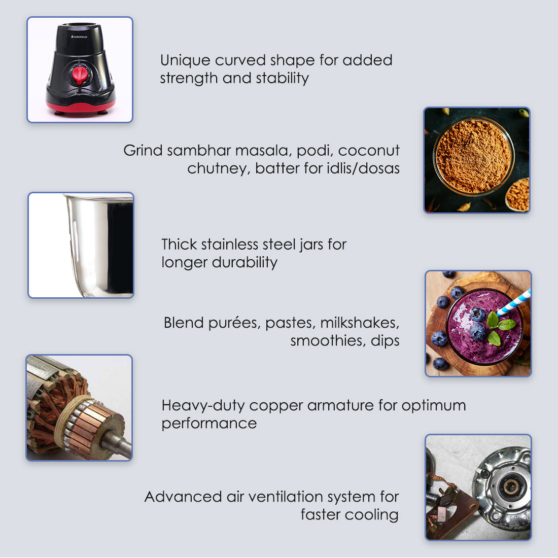- Anti-rust stainless steel blades grind even the toughest of ingredients to make amazing podi, sambhar masala, coconut chutney, garam masala, idli-dosa batter, purée, pastes, milkshakes, smoothies and much more!