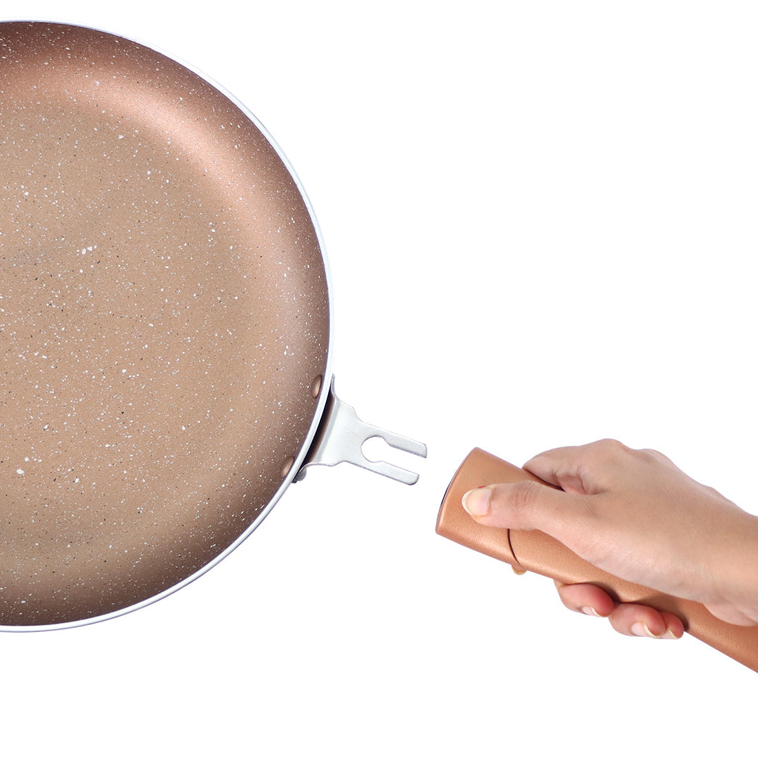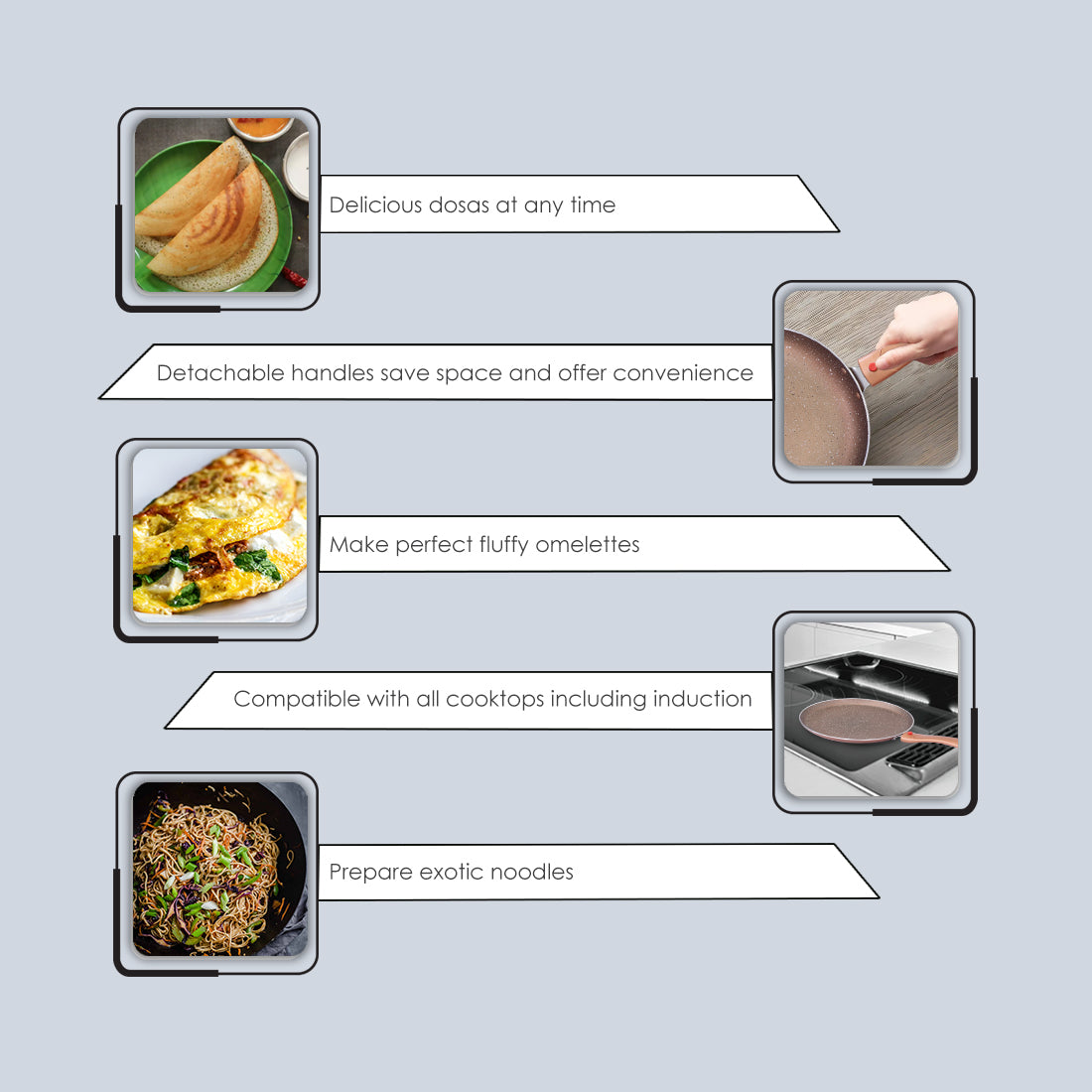 - The innovative concept of space saver with detachable handles of Fry Pan and Dosa Tawa