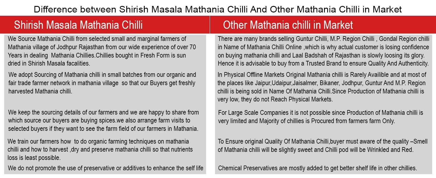 - Manufacturer (Shirish Masala ) Founded By Shah Mutha Parasmal Jain,Based Out Of Mathania area Of Rajasthan,Having 70 Years of Experiance in Dealing Mathania Chilli.