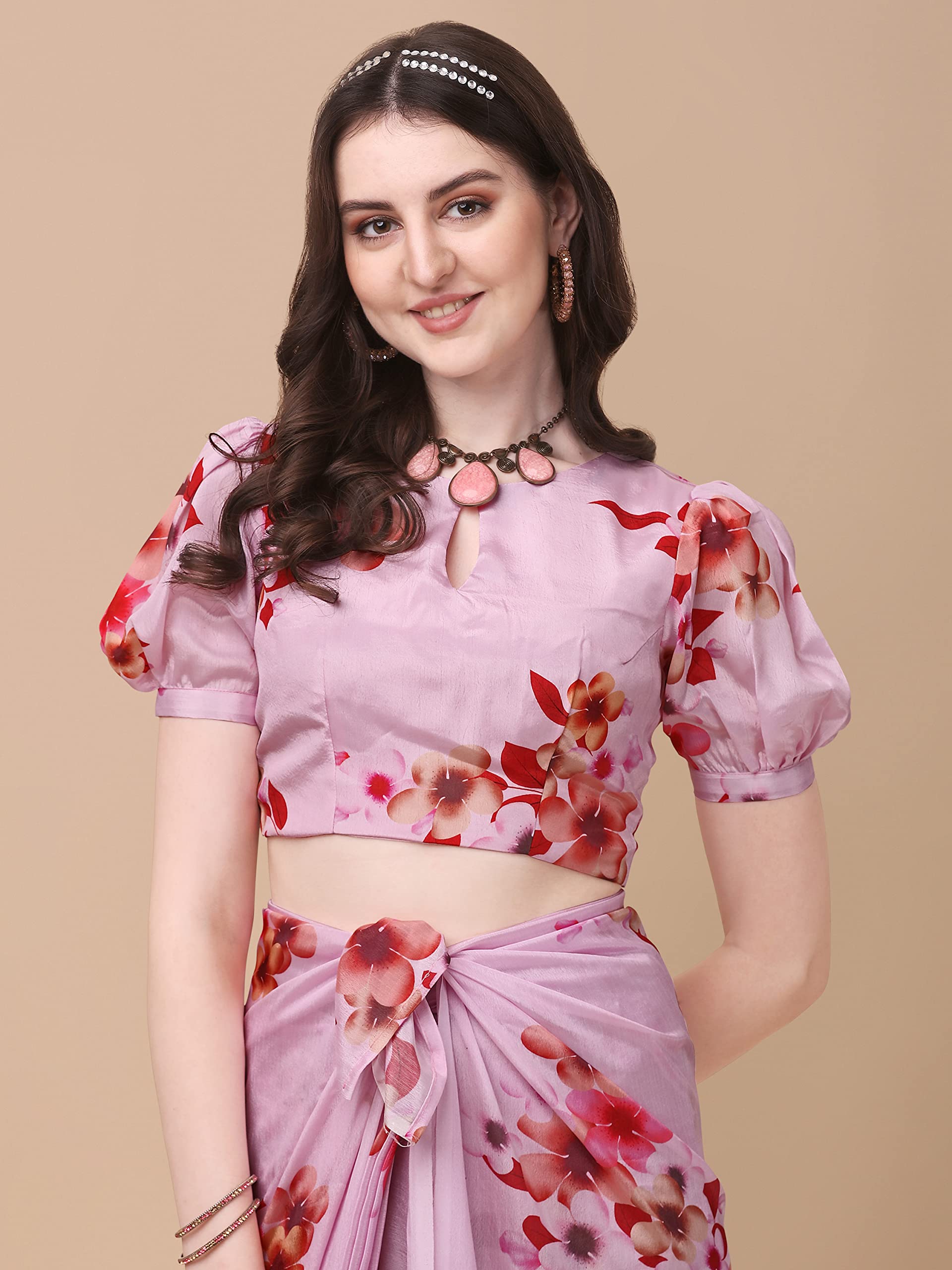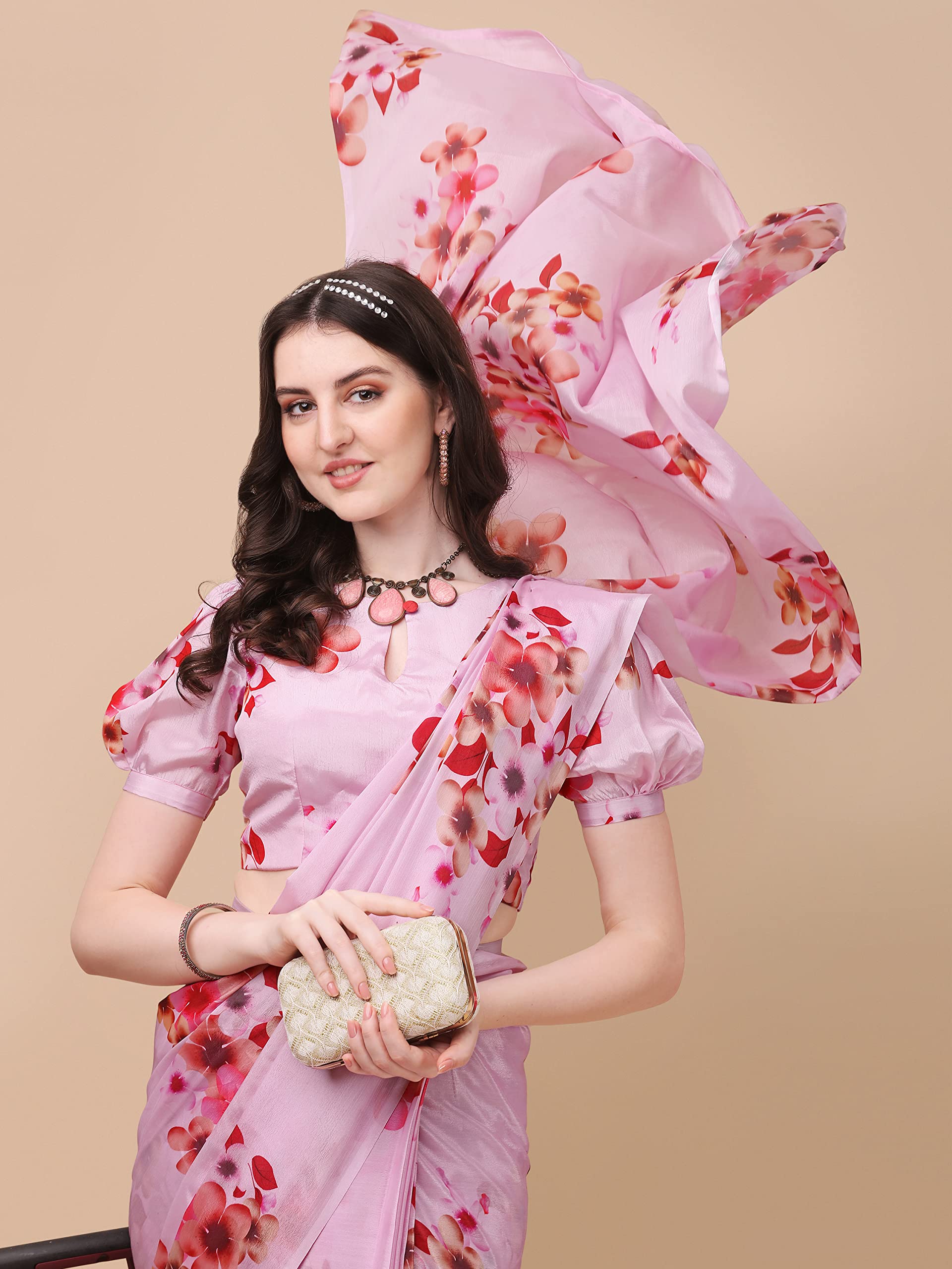 Sidhidata Women's Chifon Georgette Printed Ready To Wear Draped Saree With Unstitched Blouse Piece (Mogra Pink_Pink_Free Size)