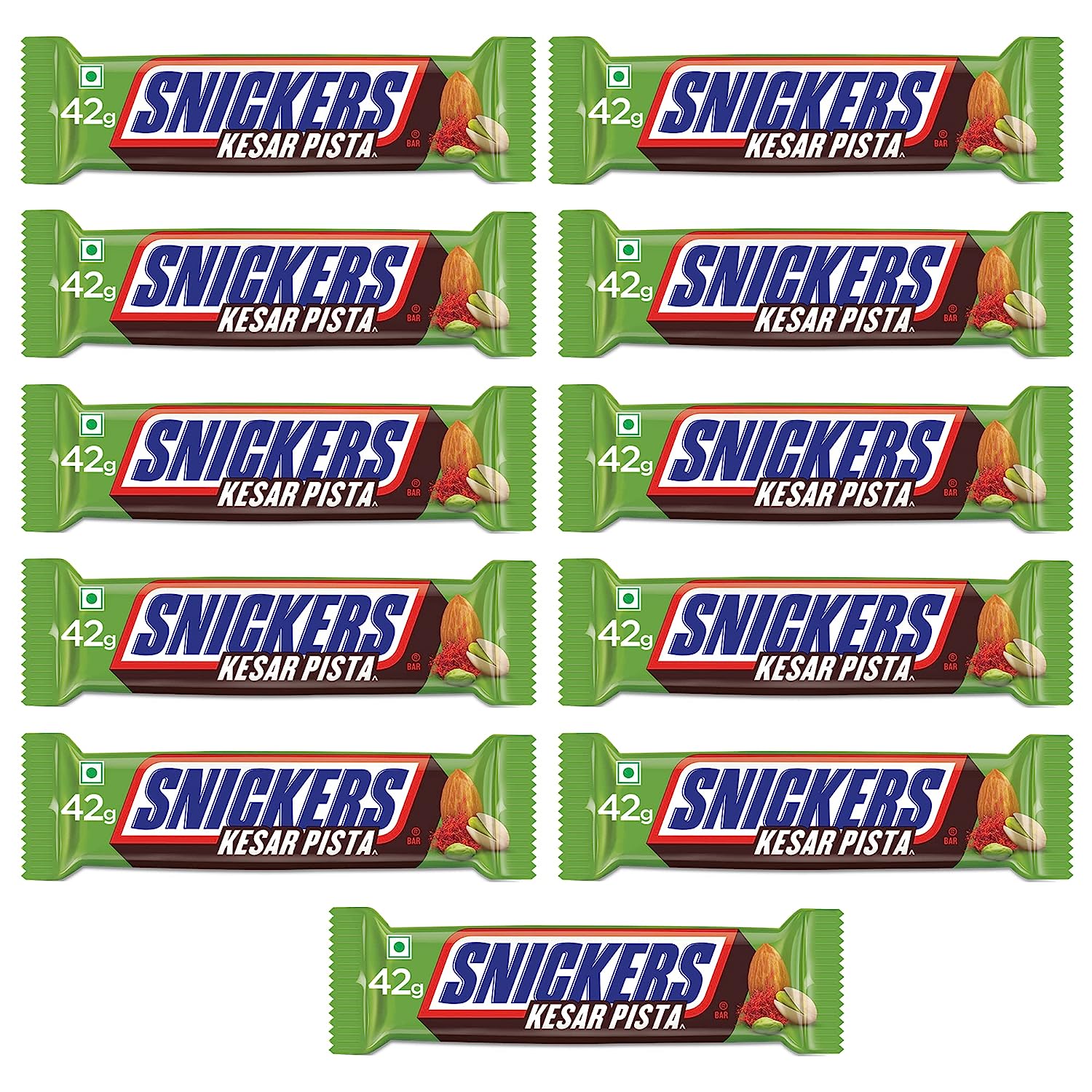 Indulge in the delicious taste of Snickers Kesar Pista Chocolate Bar. Crafted with real Snickers Kesar Pista Chocolate flavors, this 42g bar is sure to satisfy your sweet tooth. Pack of 11 to share.