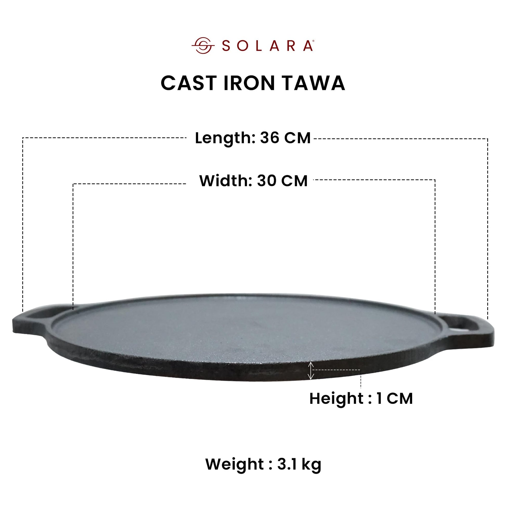 - Iron Chef Essential: The SOLARA 12" Inch (30 CM) Cast Iron Tawa offers durability, even heating, and pre-seasoned convenience. A must-have for home chefs seeking a versatile and reliable cast iron solution for their culinary needs.