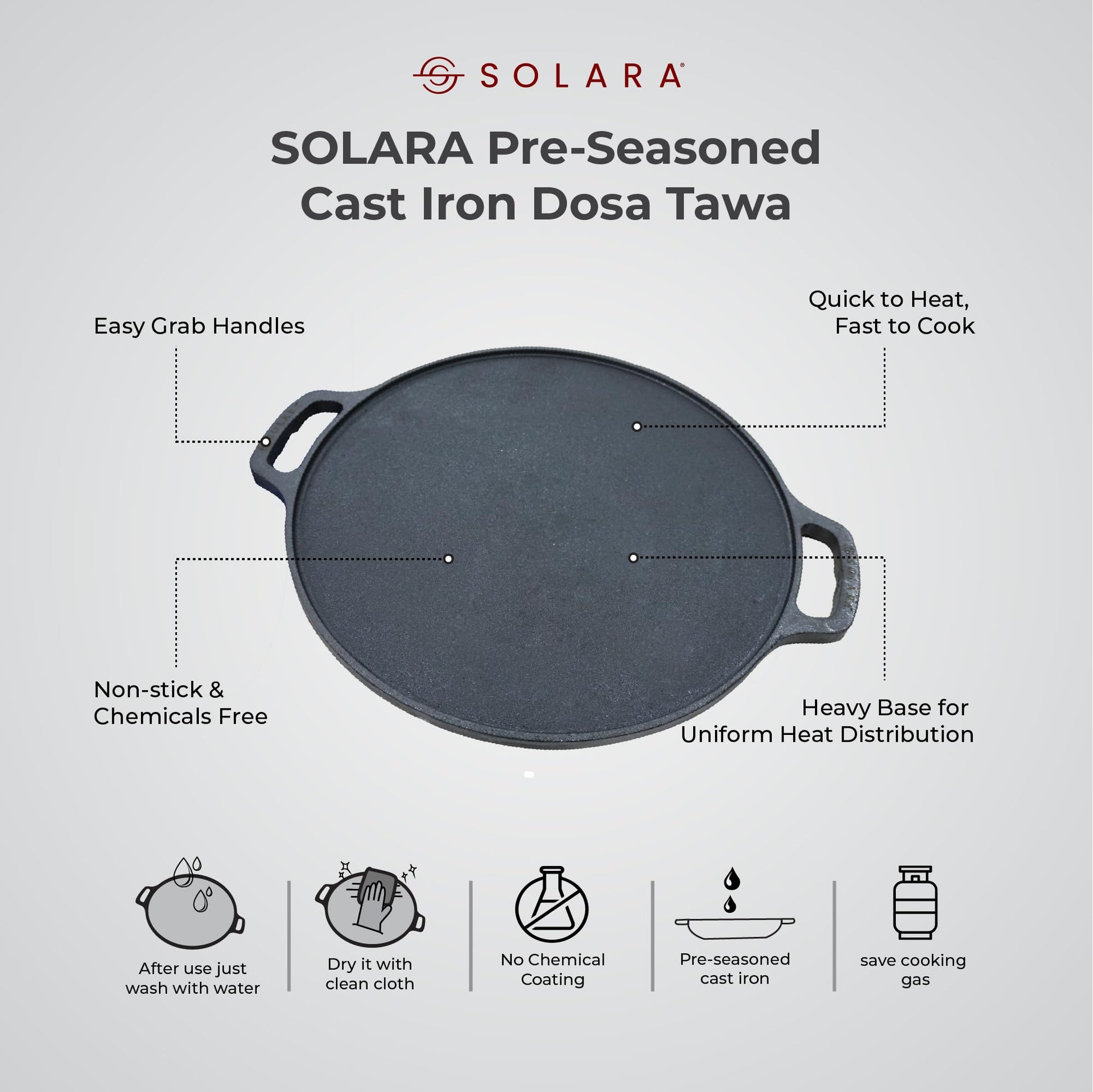 - Ready to Use: SOLARA Cast Iron Tawa comes pre-seasoned for instant use. The non-stick surface elevates flavors and simplifies your cooking experience.