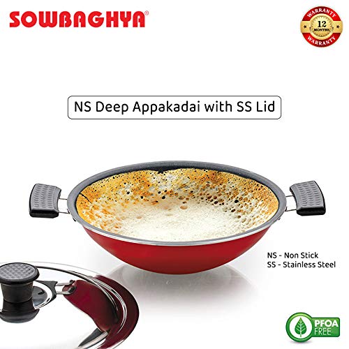 Details: Get the experiences of new-age cooking with Sowbaghya Non-stick Deep Appakadai that works on Gas Stove. It is the combination of both appachatty and kadai. It is engineered with premium coating with red matt finish for premium feel. It requires less cooking oil for cooking, Special non stick coating for long lost; double Sturdy handles. Warranty 12 Months.