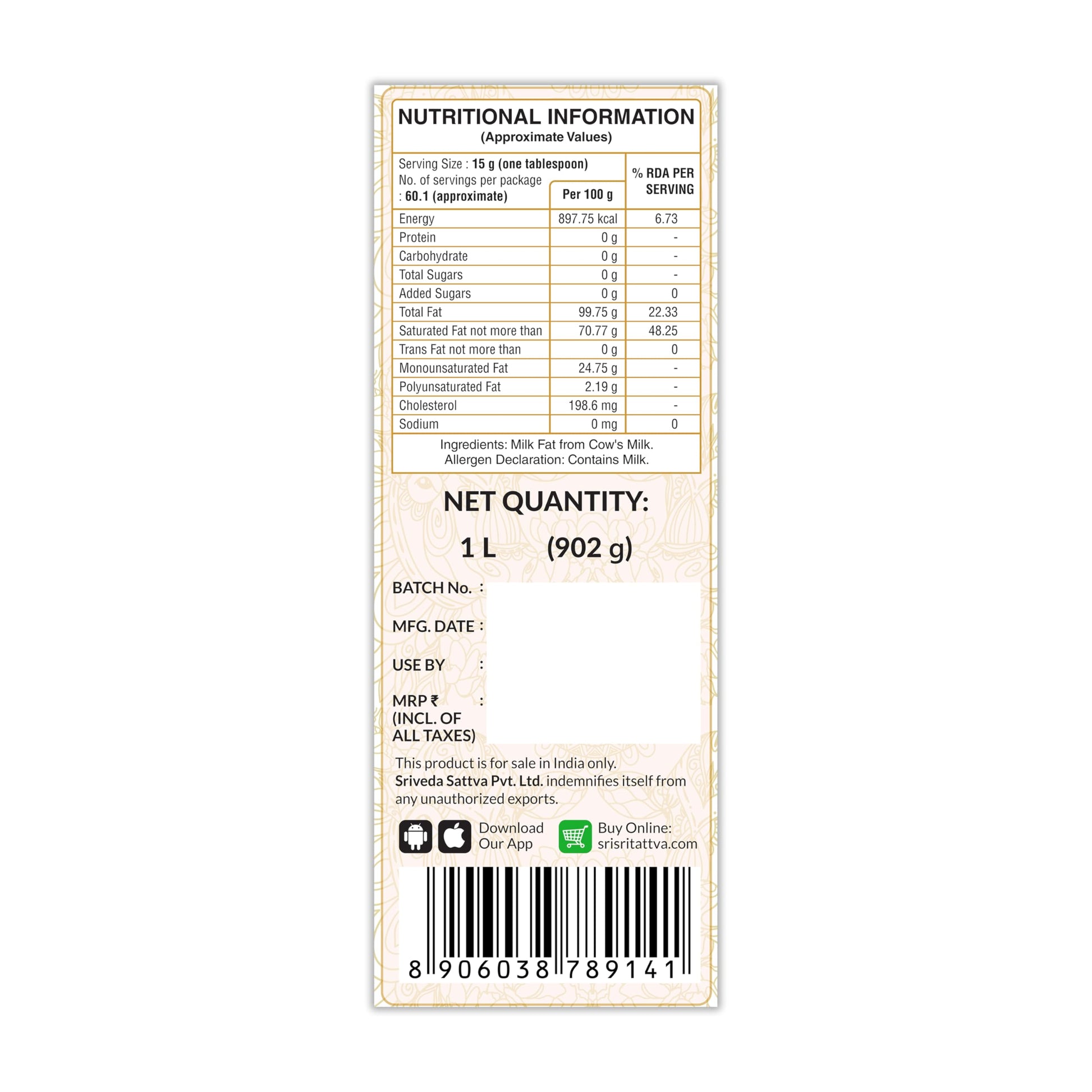 Details: Sri Sri Tattva's premium cow ghee embodies purity, heritage, and health. Our 1-liter jar of pure desi ghee is high in vitamins, antioxidants, and good fats; it nourishes the body, aids digestion, and improves overall health. The ghee offers the spirit of classic deliciousness to your life, whether you use it for cooking, adding over your favorite foods, or even in your daily rituals. This premium cow ghee a sign of purity and authenticity. Our ghee is prepared from churned butter, giving it an unrivaled flavor and texture. With Sri Sri Tattva, you may elevate your cooking experience and enjoy the purity of Cow's Premium Ghee.