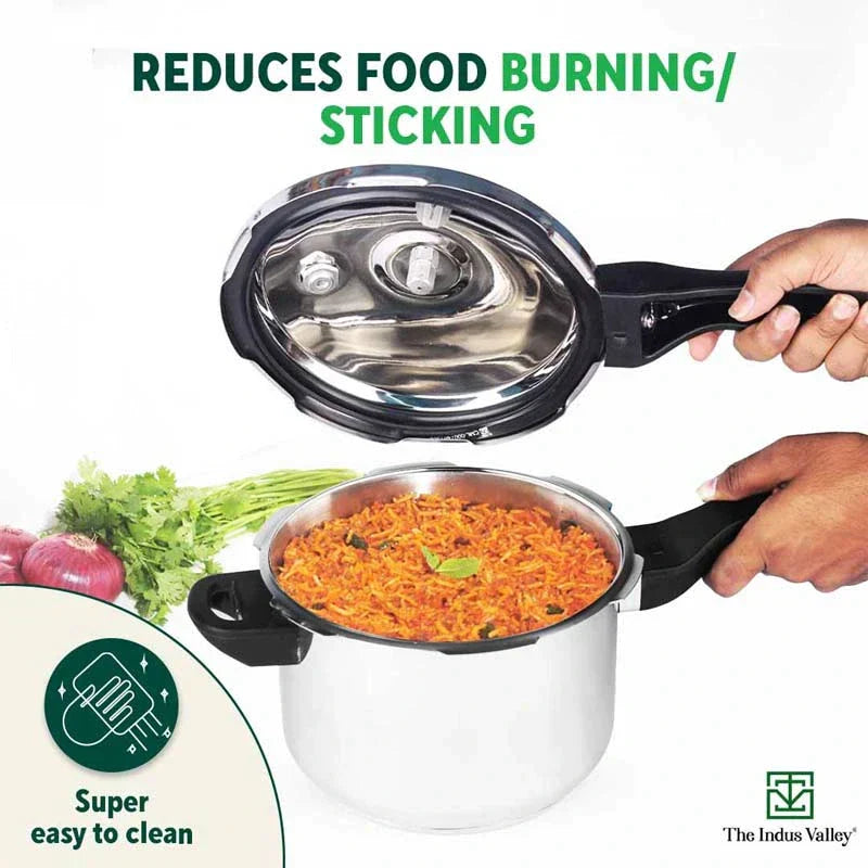 The Indus Valley Premium Stainless Steel Outer Lid Triply Bottom Pressure Cooker is made of 100% food-safe metals. The outer lid cooker is ISI certified and comes with a 3 years warranty.