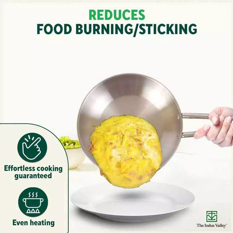 👌100% TOXIN-FREE: The Indus Valley’s Premium Stainless Steel Fry Pan/Skillet with Tri-ply Sandwich Bottom is 100% food-safe; without chemical coating. This toxin-free fry pan makes zero compromise on your health and ease of cooking.