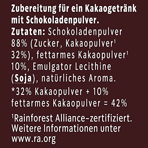 - Chocolate powder 88% (sugar, cocoa powder 32%), low-fat cocoa powder 10%, emulsifier lecithins (soy), natural aroma.
