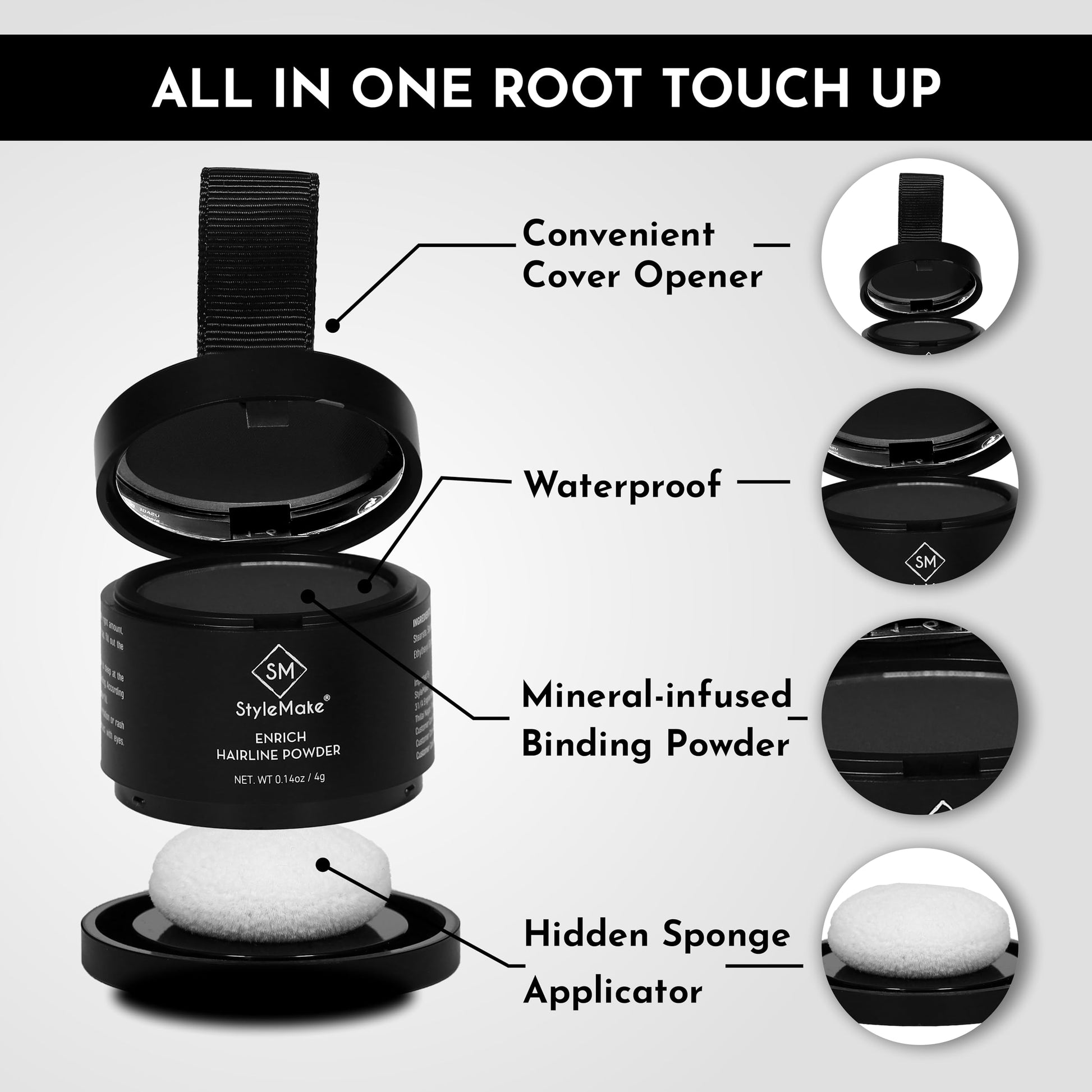 - ROOT TOUCH UP FOR GREY HAIR USER-FRIENDLY APPLICATION: StyleMake Hairline Powder is incredibly simple to use. Just apply the powder to the desired areas for instant concealment of hair loss, resulting in a flawless hairline.