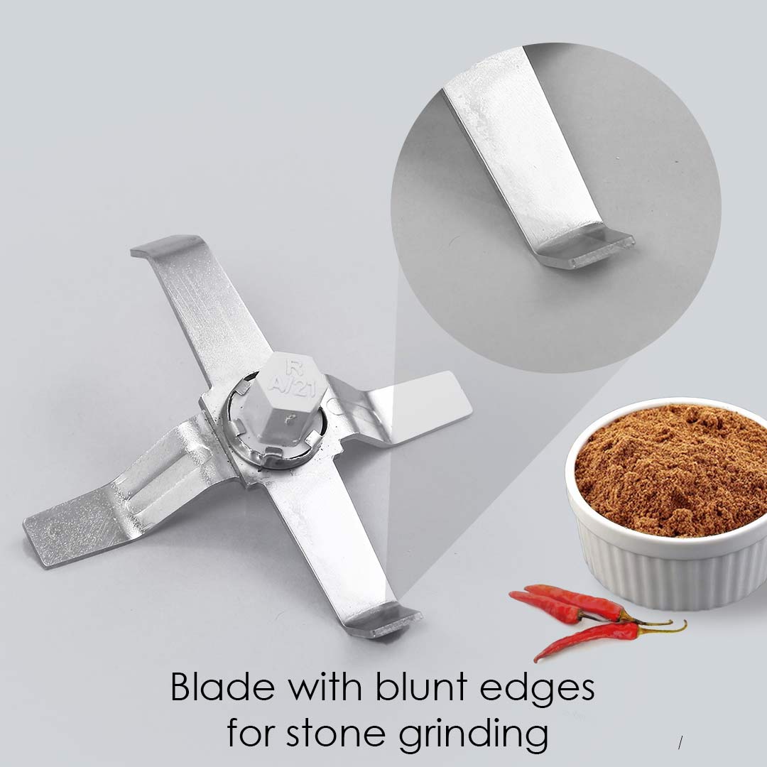 - Unique Coarse Grinding Blade with blunt edges replicates stone grinding effect on dry masalas!
