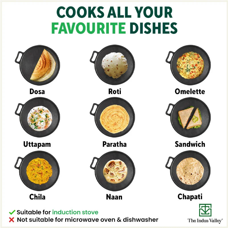💪100% HEALTHY: The Indus Valley’s Premium Super Smooth Cast Iron Tawa / Tava is made from pure cast iron. It is 100% food-safe and free from chemical coatings.