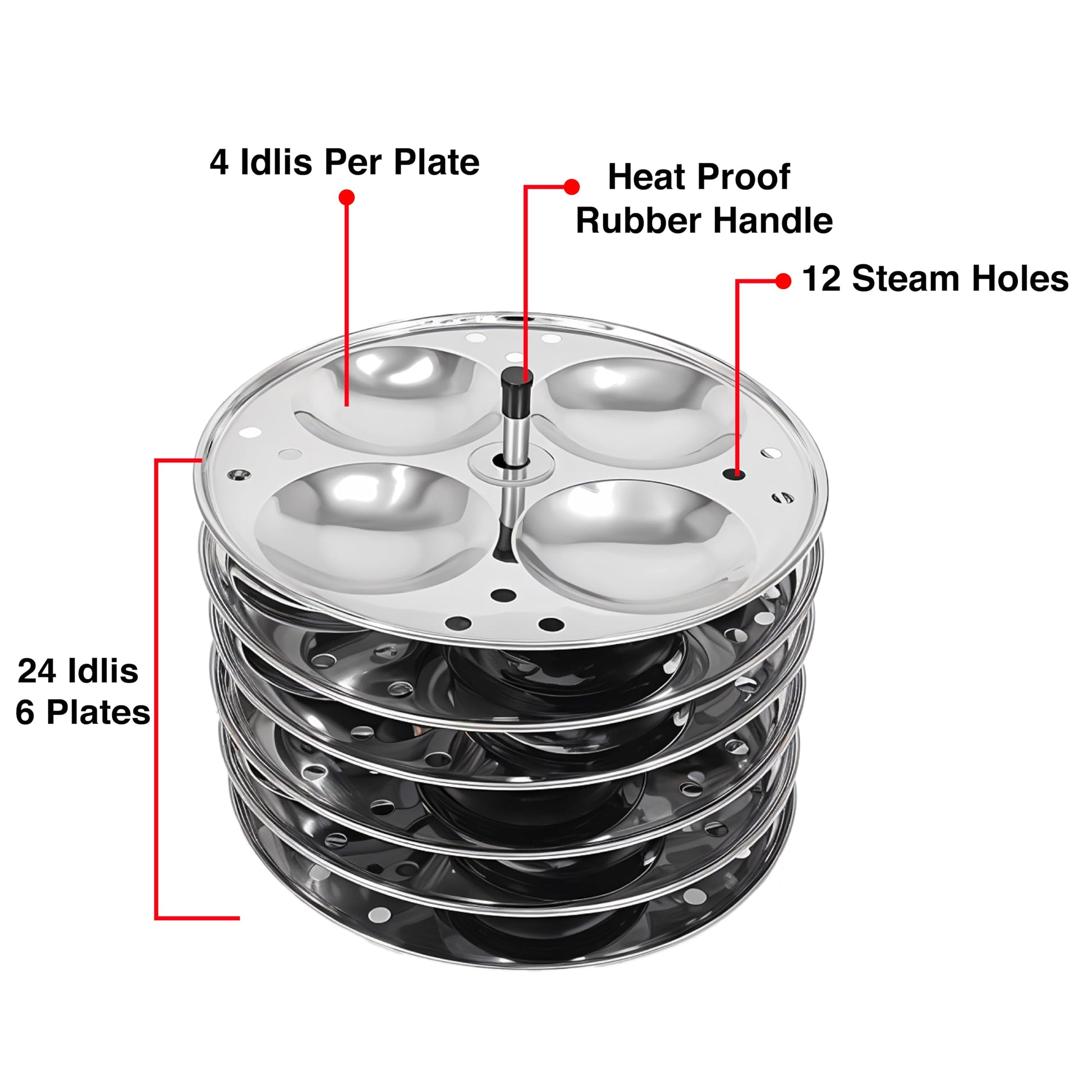 - 6 Plate Capacity – Comes with 6 idli plates, allowing you to prepare multiple idlis at once, perfect for families and gatherings.