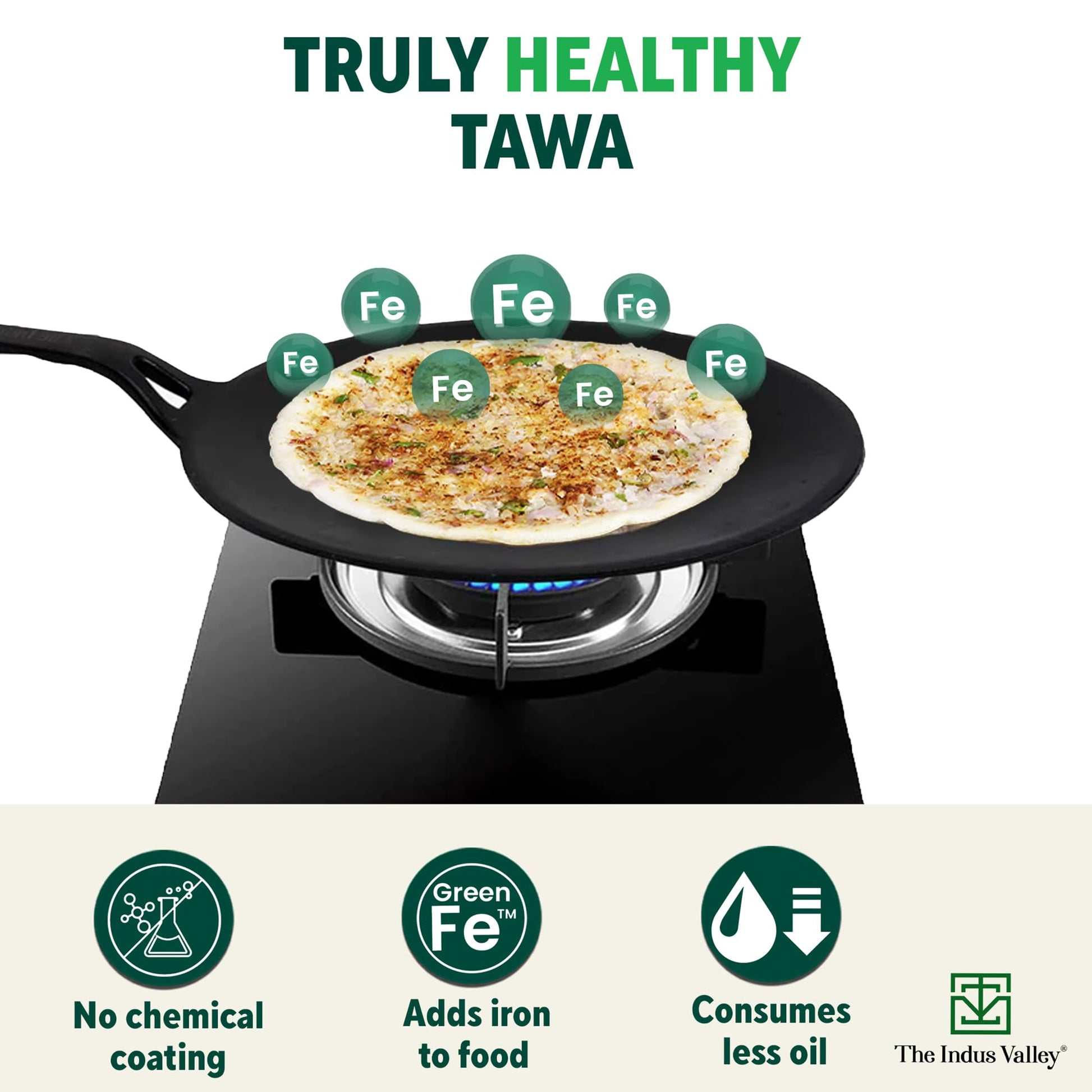The Indus Valley Pre-Seasoned Cast Iron Concave Dosa Tawa + Free Wooden flip | 25.4cm/10 inch, 1.9kg | Gas Stove Compatible | Naturally Nonstick, 100% Pure & Toxin-Free, No Chemical Coating
