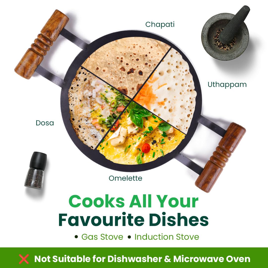 - 🍳COOKS ALL YOUR FAVOURITE DISHES: Make your favourite dishes effortlessly like paper dosa, egg dosa, chapati, uthappam, paratha, omelette and more. Also, the iron tawa is suitable for shallow-frying, roasting, searing, etc.