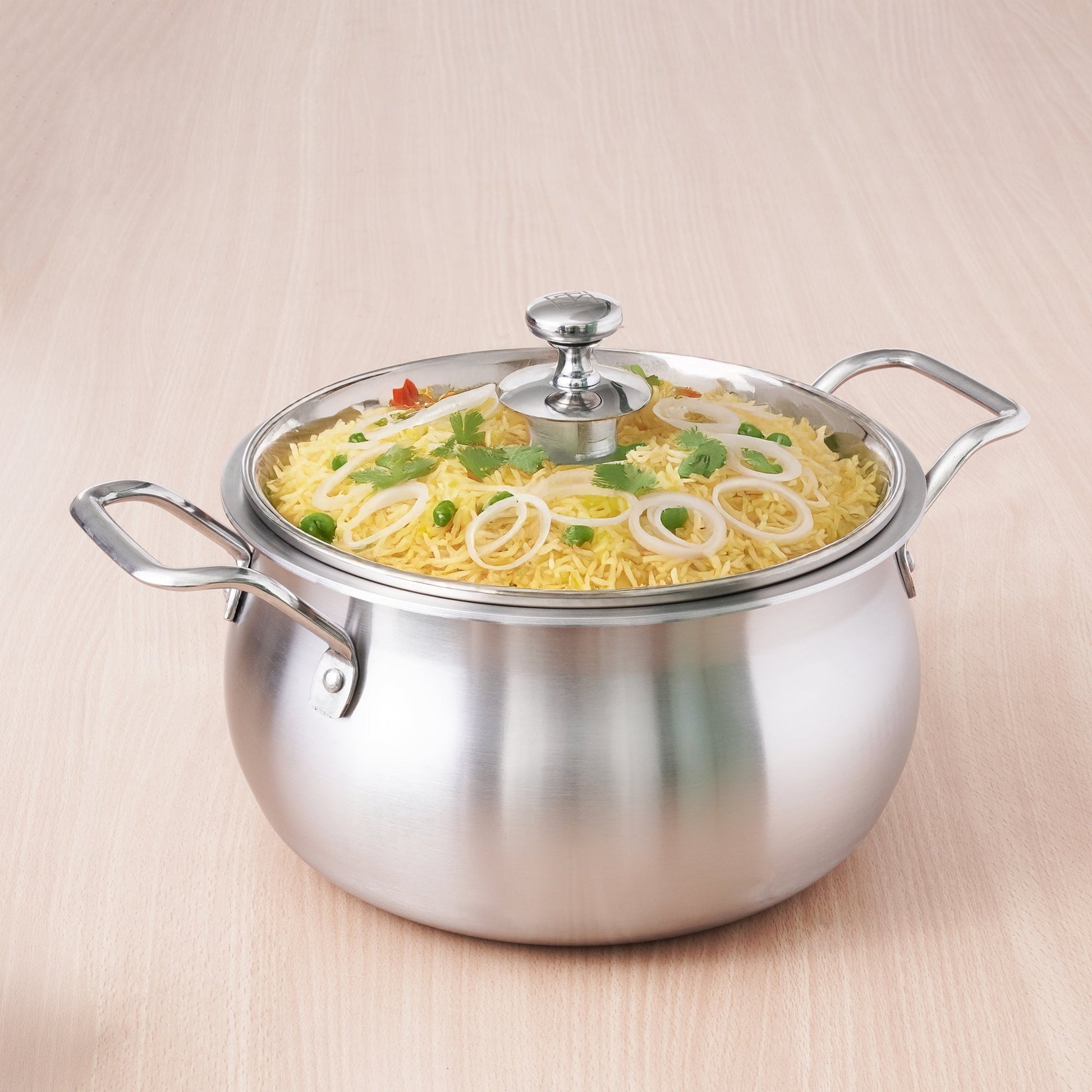 âš’ THREE-PLY CONSTRUCTION: The super tough three-ply construction of the stock pot - that is made of 3 layers of metals from base to rim - prevents food burning and sticking. It enables even heating and heat retention as well. You should definitely buy the best quality biryani pot that is 3 times better than normal stainless steel pot and the ones which have tri-ply only at the base.