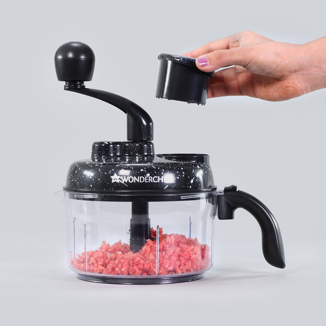 Use the pusher to push in vegetables, fruits or any other ingredient