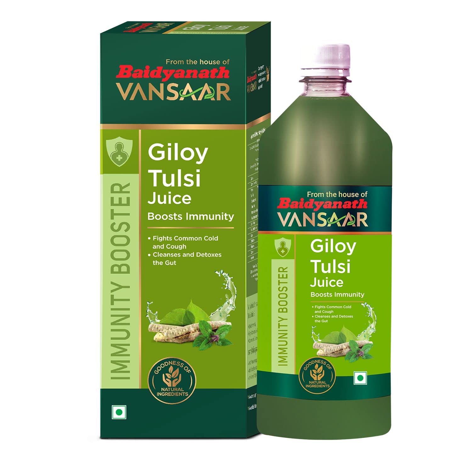 Vansaar Giloy Tulsi Juice is made with a 100-year-old legacy of uncompromised quality. Blending the health benefits of Giloy and Tulsi, this Ayurvedic juice offers natural immunity boosting properties and helps enhanced energy and stamina. Enjoy a healthy life with Vansaar Giloy Tulsi Juice.