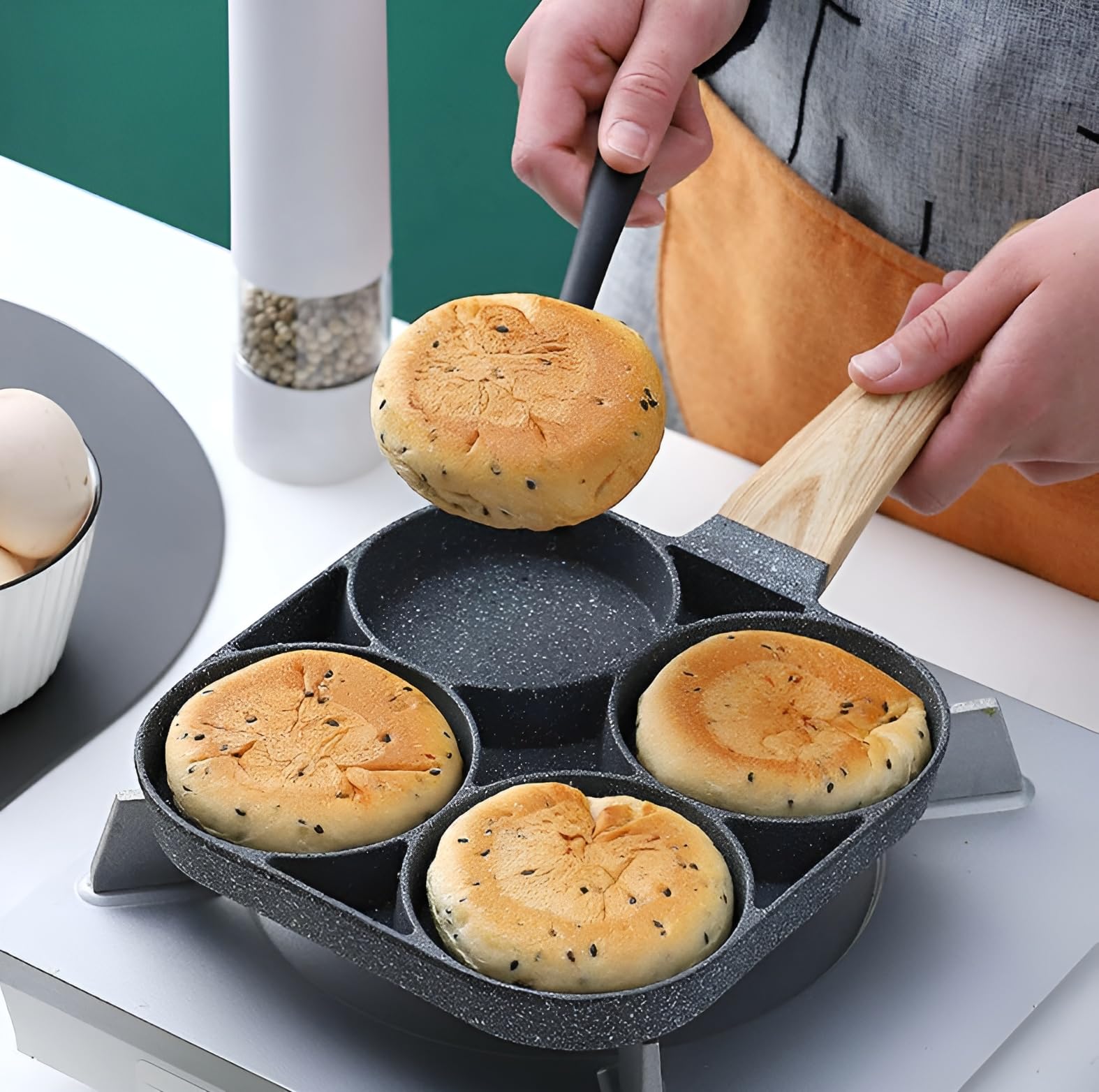 - The egg frying pan nonstick is gas stove compatible. Perfect for cooking omelets, bacon, burgers, pancakes and making four fried eggs at the same time, suitable for breakfast making.