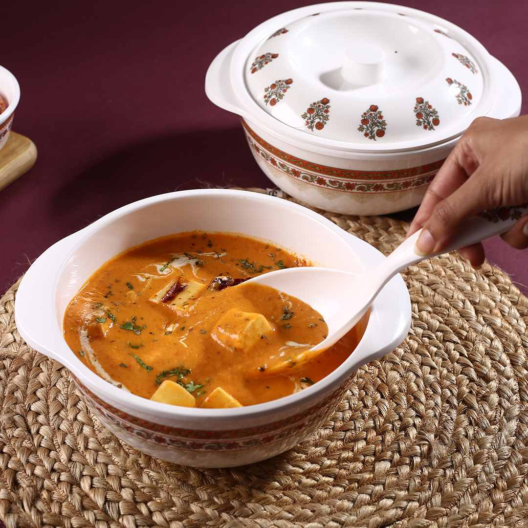 The Venice premium melamine dinnerware collection in classic floral design merging with intricate pattern in hues of red and green create an elegant outlook to your table. Stylish, versatile and feather light, the Venice casserole set of 2 with lids are great for serving hot curries, rice or even biryani. It is a perfect way to add some Indian elegance to your dinner table. Enhance your dining experience with these cassseroles. Great finish and quality, the set of 2 casseroles is a must have for your meals. It will be a perfect addition to your dinner plates from the same collection.