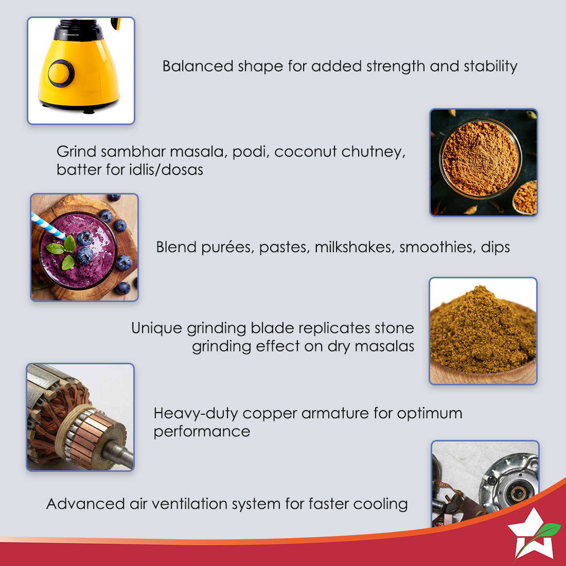 - Anti – rust stainless steel blades for grinding toughest masalas, to make chutneys, batters, purees and much more. The jars with flow breakers ensures proper grinding every time