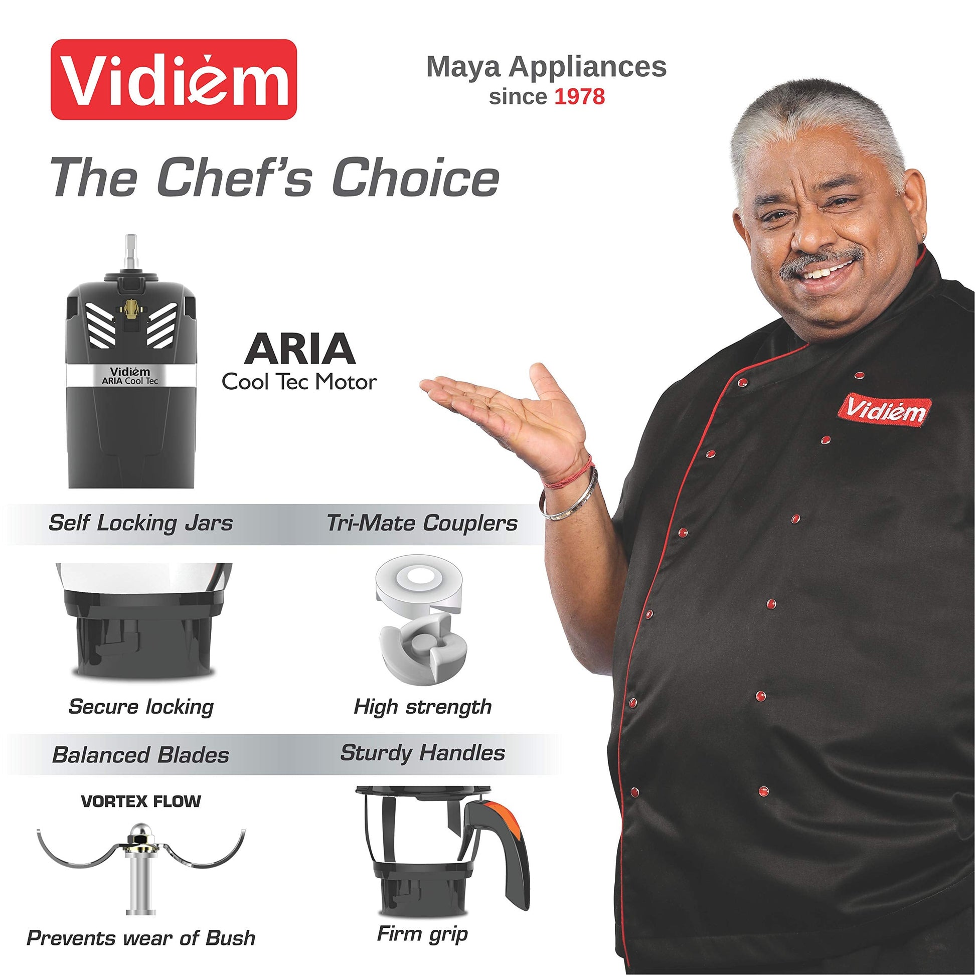Details: Vidiem MG 521 A VSTAR Evo 750 Watts Juicer Mixer Grinder with 3 Jars. ARIA Cool Tec Motor, Self Locking Jars, Dynamically Balanced Blades, Tri-Mate Couplers & Sturdy Handles. Voltage: 220V – 240 V AC ...