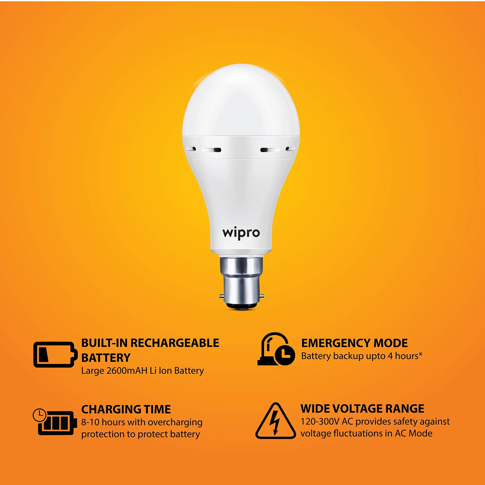 wipro Garnet 9w LED Emergency Bulb | Cool Day White (6500K) | B22 LED Bulb Base | Inverter Bulb for home, with 4 Hours battery back up| Li-ion Battery | Over charging Protection | Pack of 1