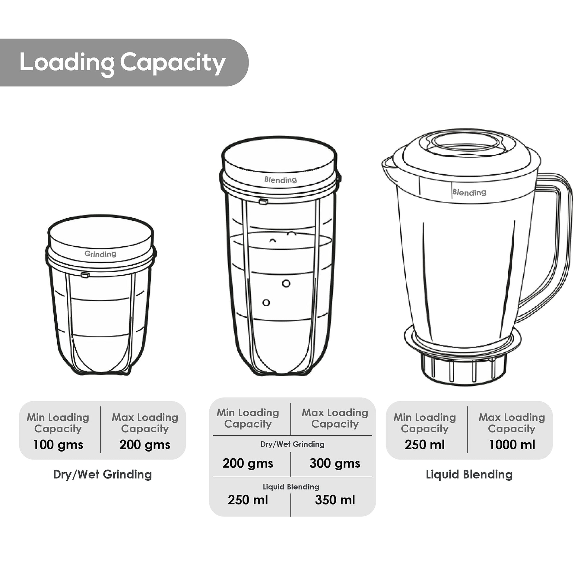 - Specialised Functions: The Long Jar (500ml) comes with 4-wing blade for mixing-blending and the Short Jar (300ml) with 2-wing flat blade for grinding to make all kinds of chutneys, shakes, smoothies and masalas. One useful lid – for storing and sprinkling comes with the product. Additional 750 ml Juicer Jar makes this product as multi-purpose machine for all the kitchens.