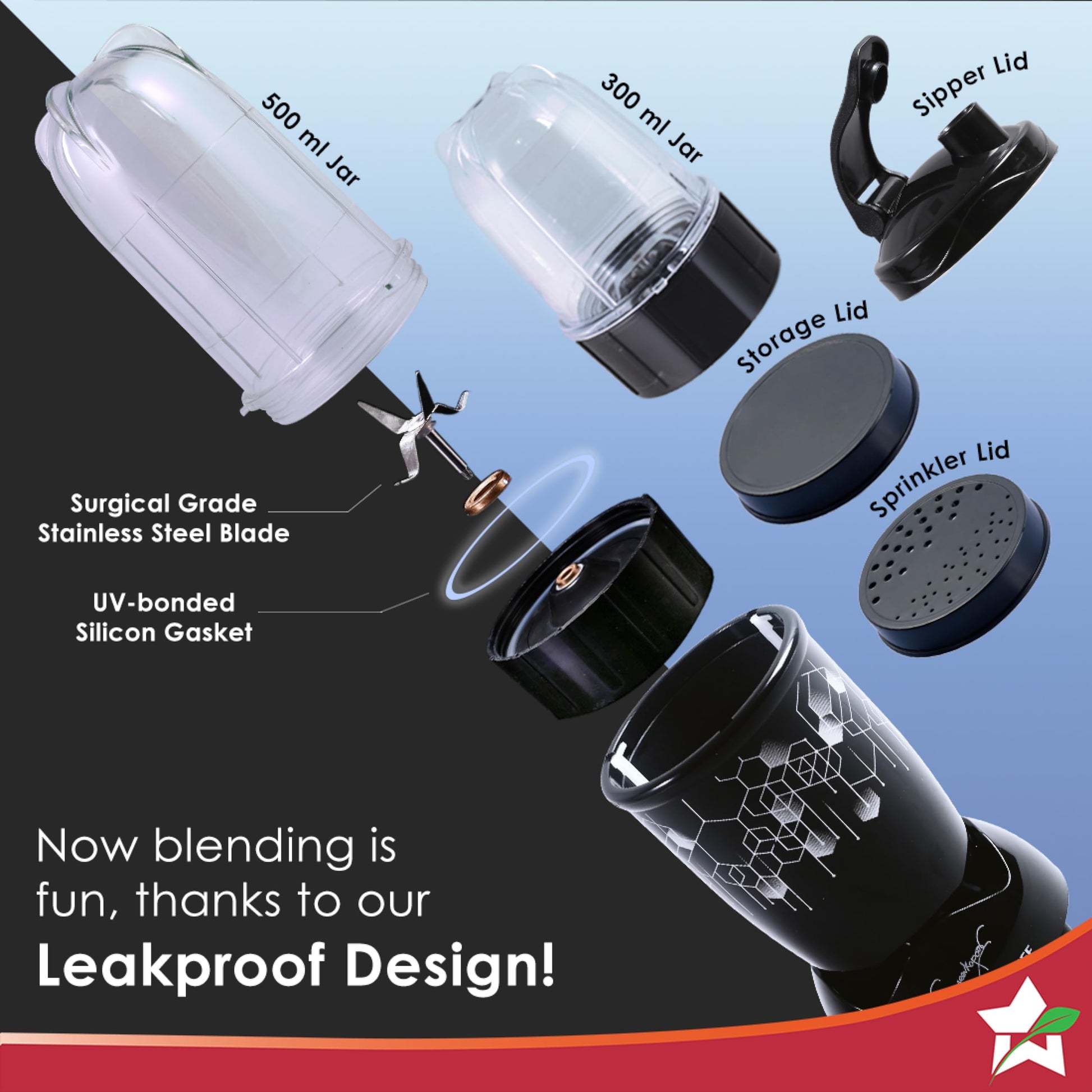 - TRANSPARENT & UNBREAKABLE JARS: Monitor the progress without opening the jars. Use the tall jar (500ml) with a 4-wing blade for mixing-blending and the short jar (300ml) with a 2-wing flat blade for grinding