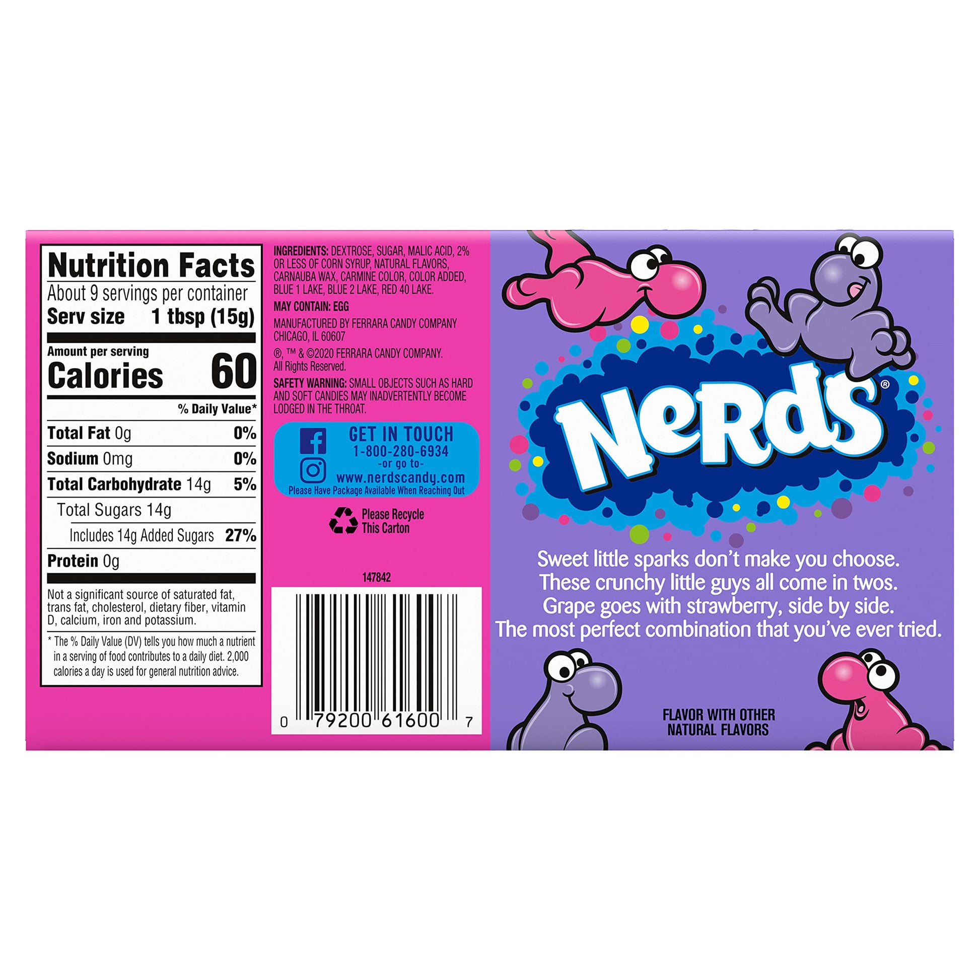 Indulge in a tiny, tangy and crunchy experience with Wonka's Gotta Have Grape & Seriously Strawberry Nerds Candy. Enjoy the unique combination of color, texture, and taste that only these dual chamber candies can provide. Perfect for satisfying cravings and sharing with others. Try all of our delicious flavors, from original to big chewy.